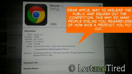 Having said that, while downloading the Google Chrome Browser to my iPad this morning, I received a message saying that this was a restricted app, due to inappropriate content.