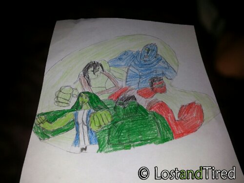 Gavin spent a good portion of the day working on this picture. It's his interpretation of some cover art from the new Incredible Hulk cartoon that's coming out.