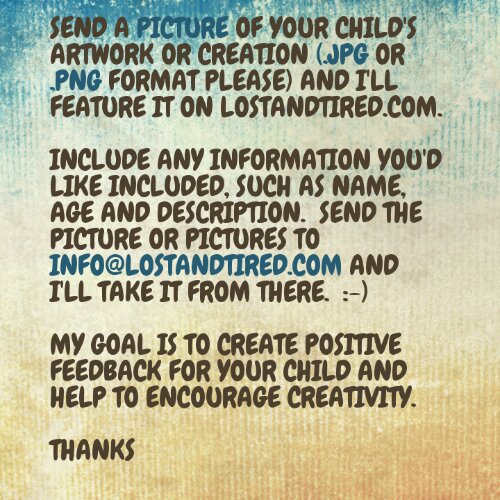 Simply shoot me an email and include whatever you'd like to share, including name, age and description of the creation and I'll feature your child's Artwork for an entire day.