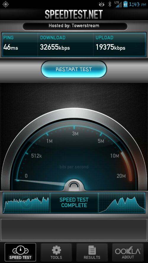 Of course, I have to drive about a mile up the road to catch a reliable LTE signal but when I do it's amazing. See the screenshot below. This is T-Mobile's LTE service at my parents house, 5 minutes up the road from my house.