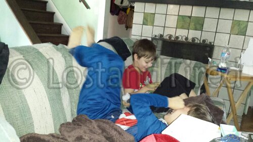 In the above picture, the boys are patiently waiting for Lizze's parents to arrive. Elliott has insisted on wearing his Captain America costume. We unsuccessfully tried to talk him out of this so we just let him be comfortable and wear what he wanted. **:-)