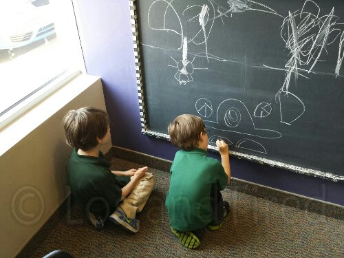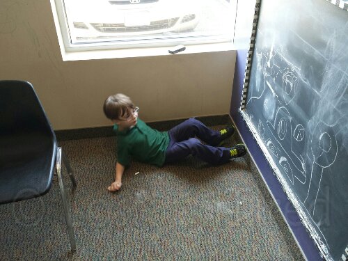 Now I'm just speaking with Gavin's case manager on the phone and finishing an assessment for him while Emmett draws on the chalkboard and Elliott is doing OT.