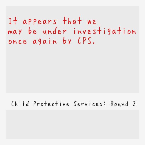 The second and most likely scenario is that we have been reported again, perhaps by the same person and instead of coming to us first this time, CPS is going straight to the doctors and our support team. They already have signed releases on file and having just been exonerated of the previous accusations, maybe they are looking into to things prior to involving us directly.