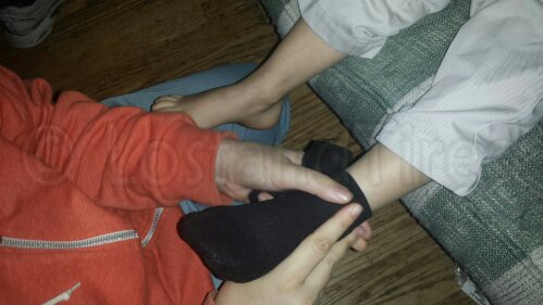 It's not easy to put shoes and socks on a kid that can't stand the way they feel against his feet. There is a process to helping him through this. Sometimes it works and other times it doesn't.