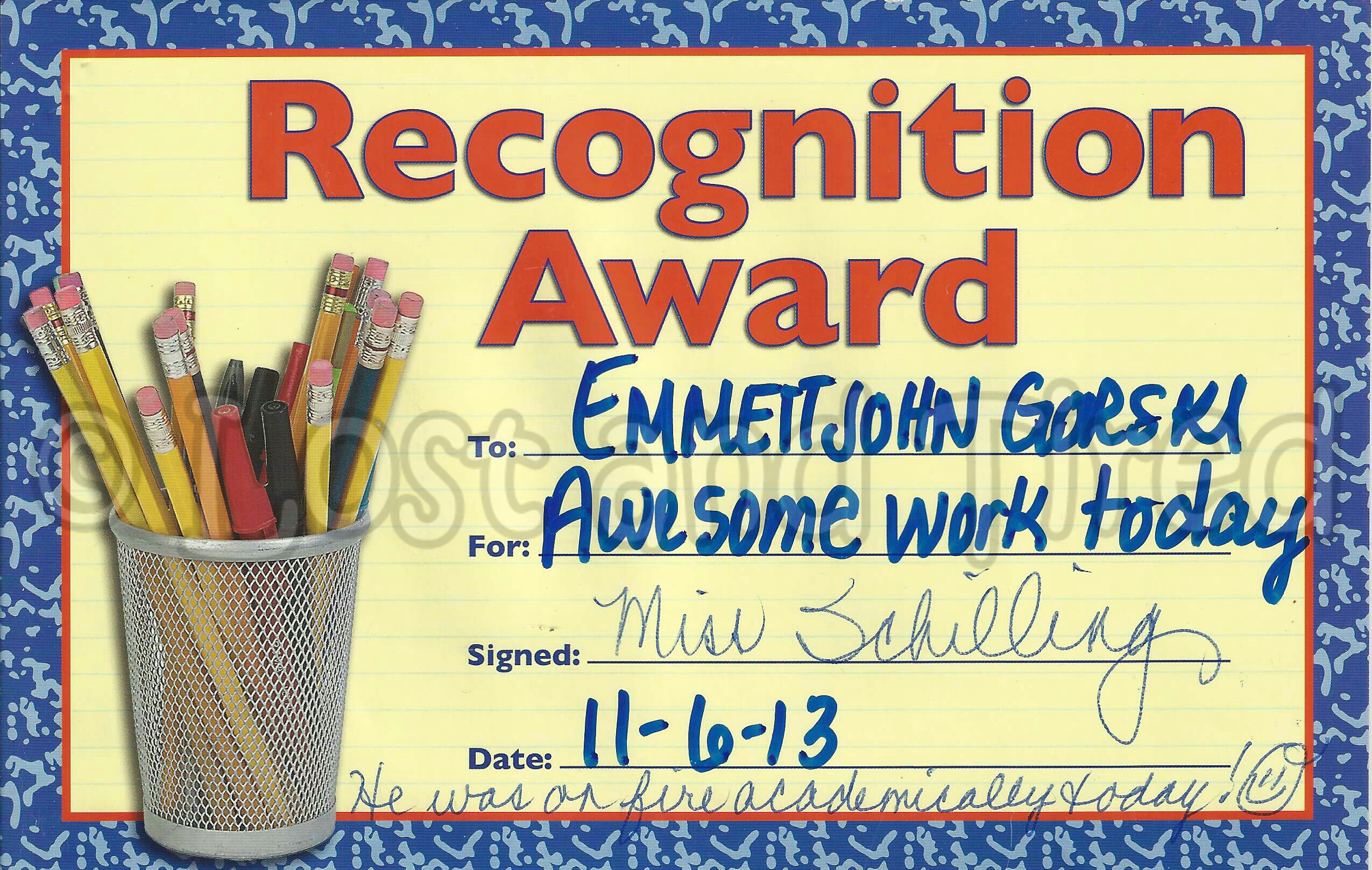 I just now saw this but Emmett brought it home in Wednesday afternoon. Lizze and I are so proud of him for being himself and doing so well. :-)