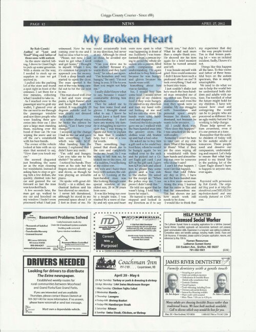 This particular one was published by the *Griggs County Courier (established 1883).* This is based out of Cooperstown, North Dakota and published on April 27, 2012......