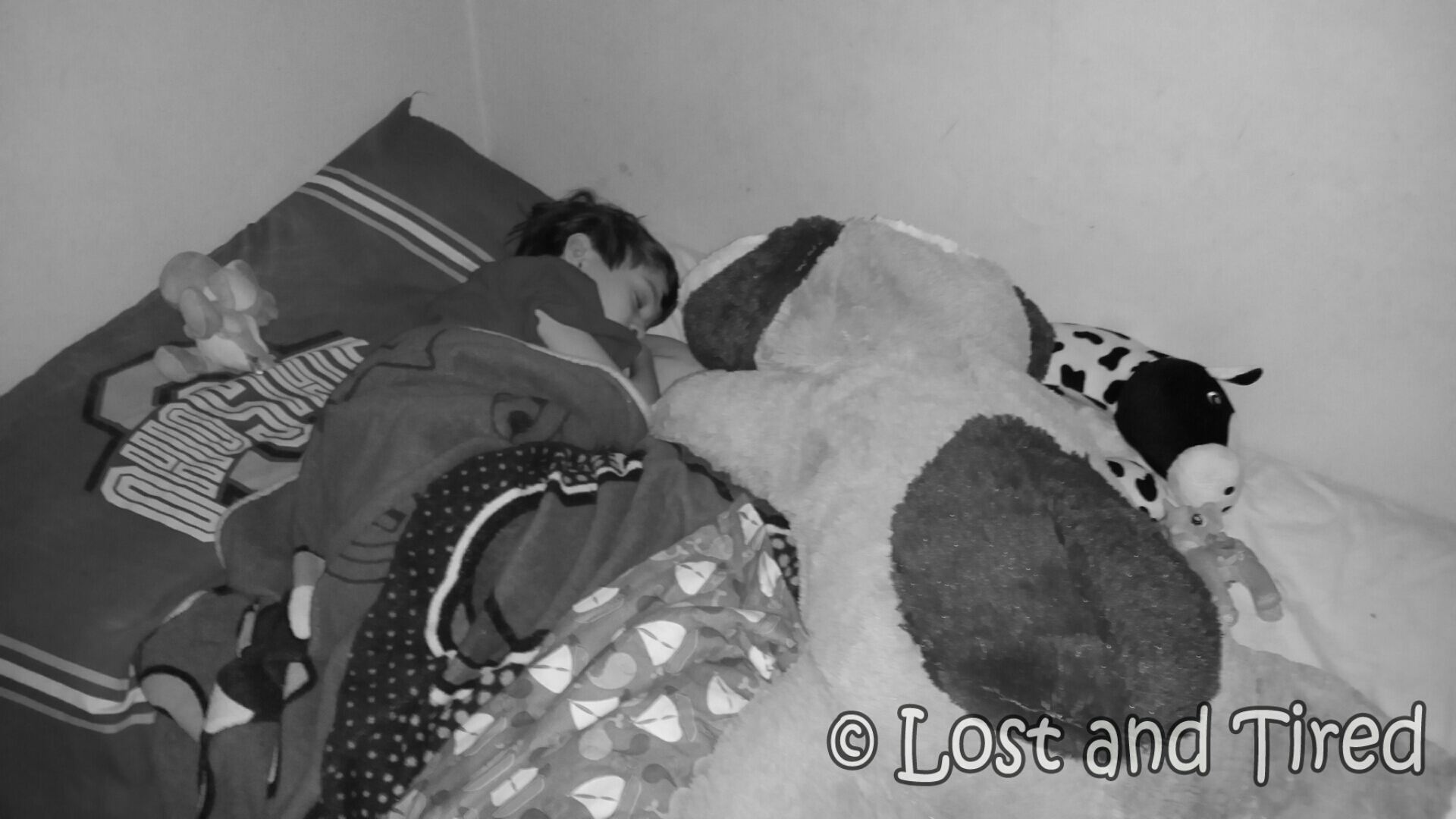 He's snuggling with the giant stuffed dog he got for Christmas this year. It's literally bigger than he is and it's super comfy to snuggle with. Elliott enjoys laying underneath this puppy and seems to find comfort in it.