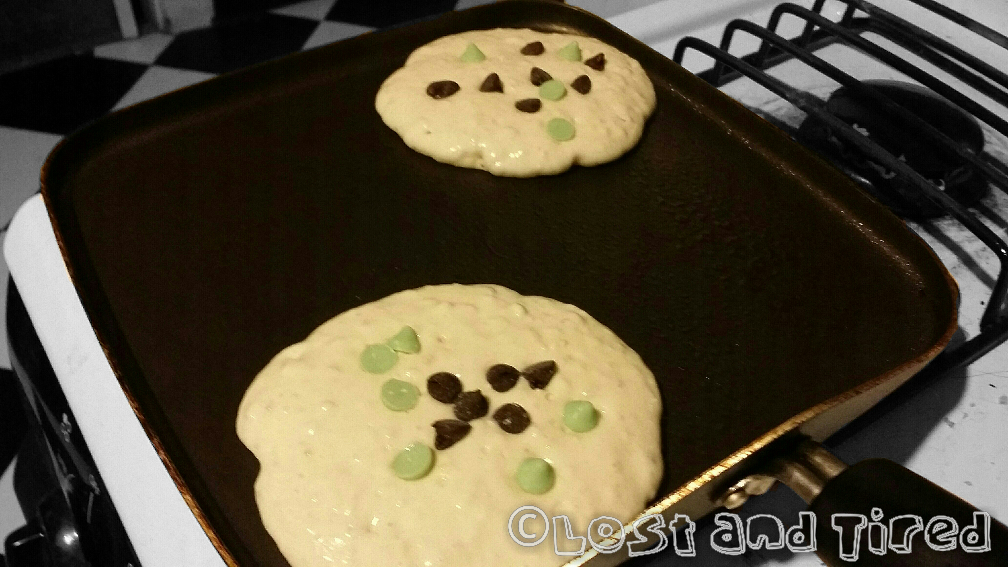 I started making pancakes and adding a ton of oatmeal to the batter. In order to make it so they don't notice the oatmeal and refuse to eat them, I sprinkled a few chocolate chips on top of the pancakes.