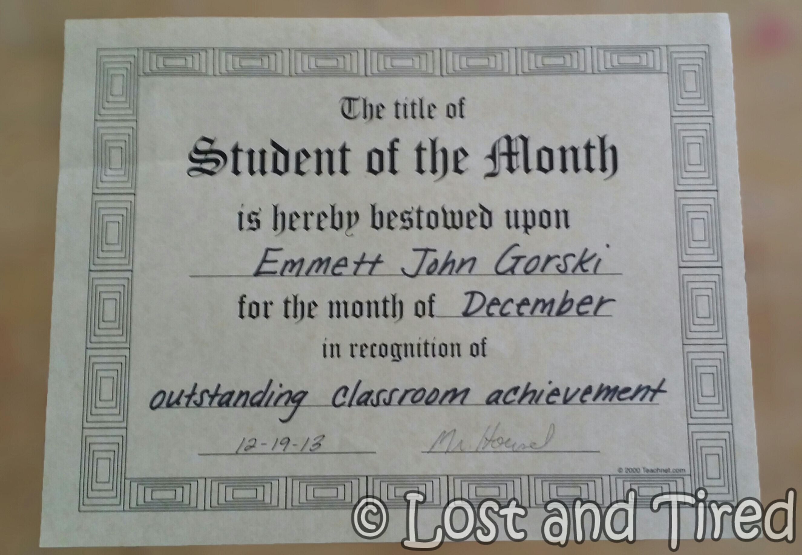 The next one is his Student of the month certificate from last month. They re-issued it due to a typo in his name.