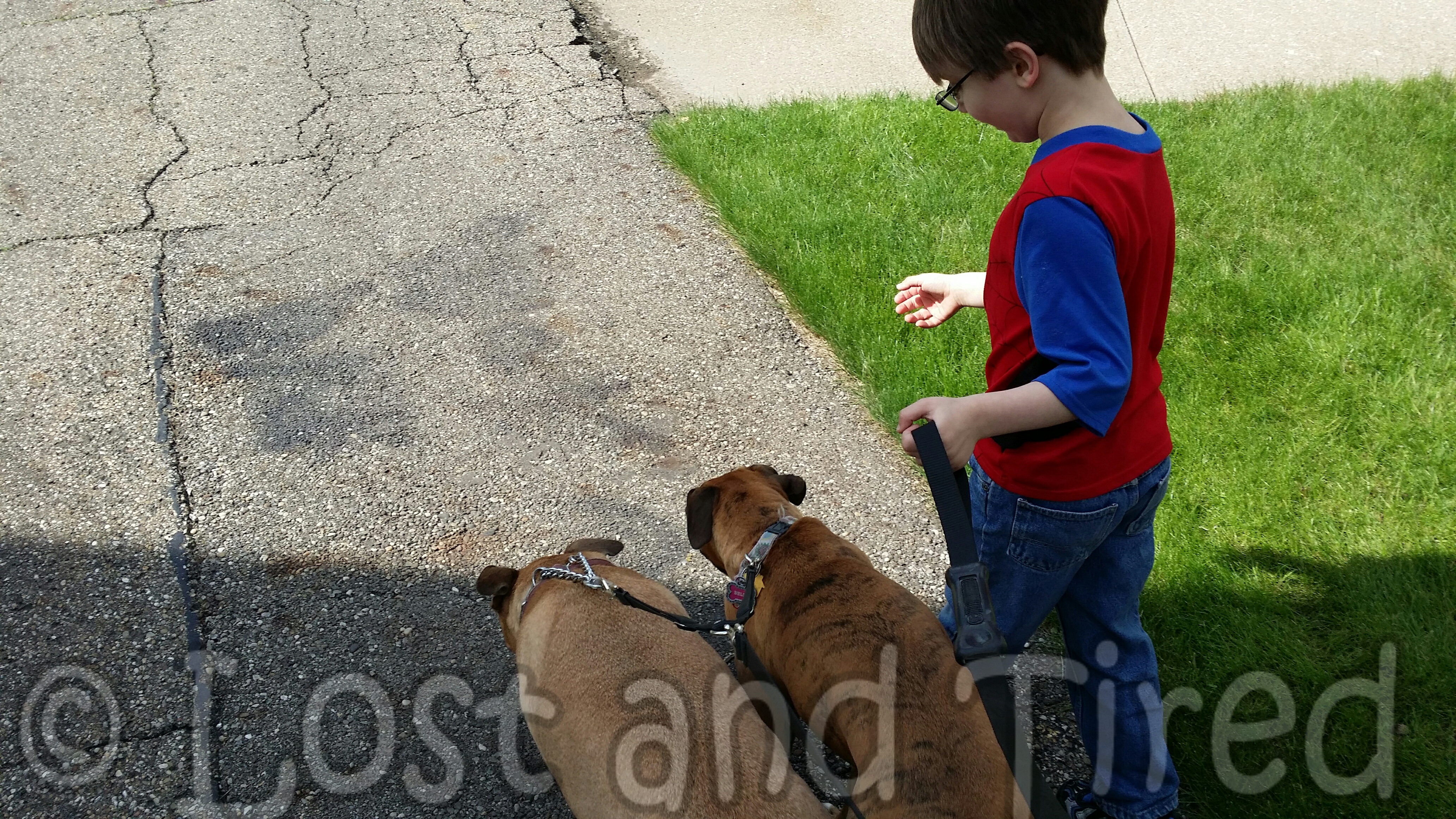 However, I did take Elliott and Emmett out for walks with the dogs today. Bella and Maggie had so much fun. Emmett wanted to physically hold the leash all by himself and Elliott was thrilled to look for rocks along out 1.25 miles journey.