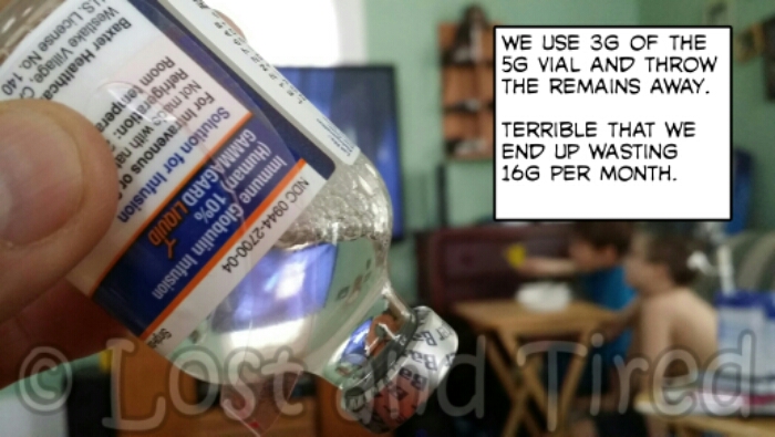 For the last few months there has been some kind of shortage. Apparently, you can't get the 1g or 3g vials of *GAMMAGARD *right now. In order to fill Gavin's prescription, we have been receiving 5g vials each month.