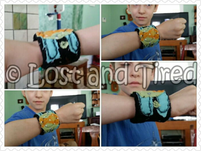 Before I could even mouth the words *don't even think about it*, Elliott had removed the paper parts and cut out replacements from fabric and wanted me to sew them on to the wristband.