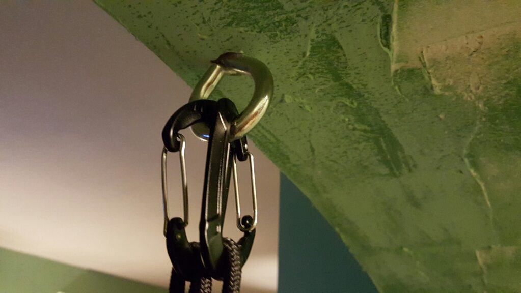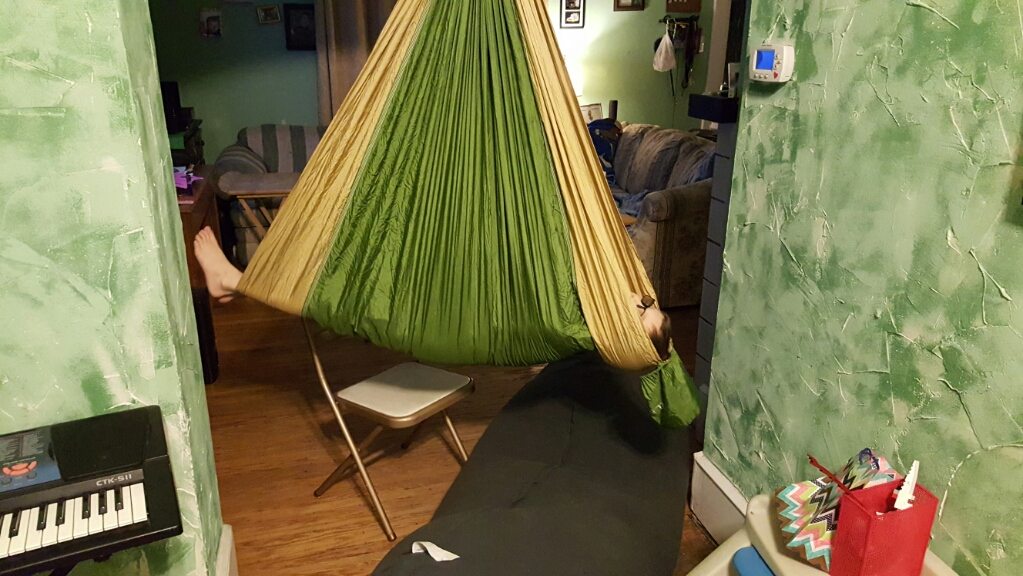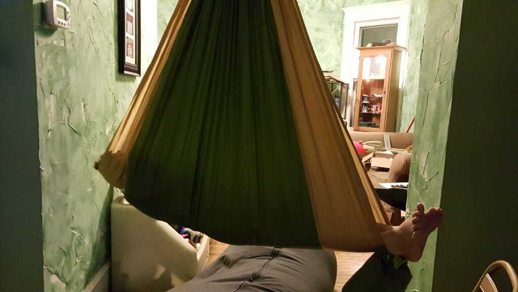Finally, I simply attached both sides of the hammock to the eye hook via carabiner and voila, homemade sensory swing.