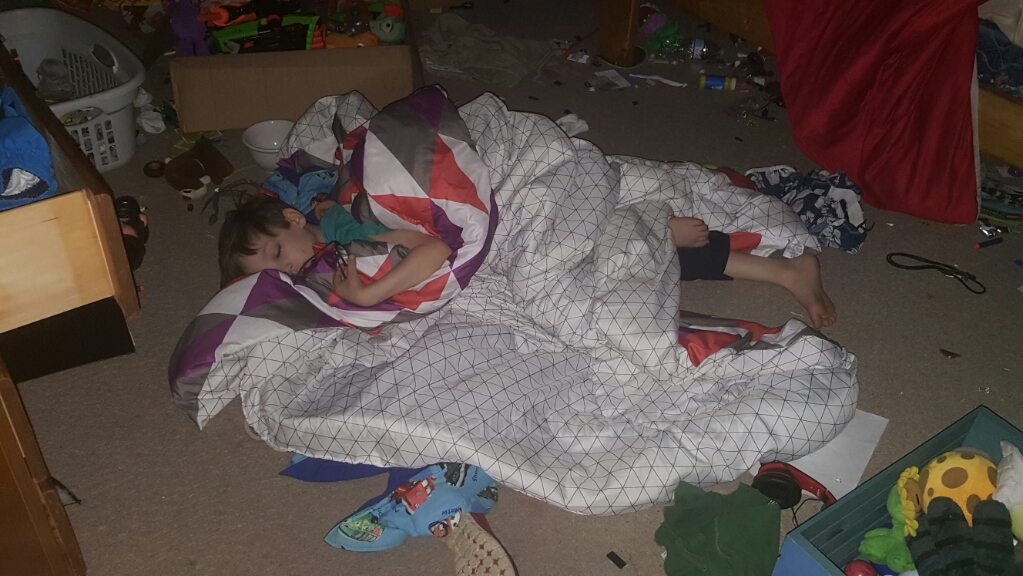 I found Gavin asleep but hanging off the side of his bed, supported only by his arm. He was actually supporting himself with his arm, while he was sleeping. I don't know how else to describe it.