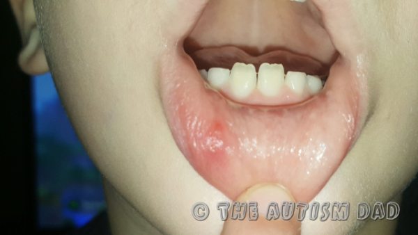 On Saturday night, Emmett began complaining of his mouth hurting. When I checked it out for him, I found a rather large mouth sore on the inside of his lip.