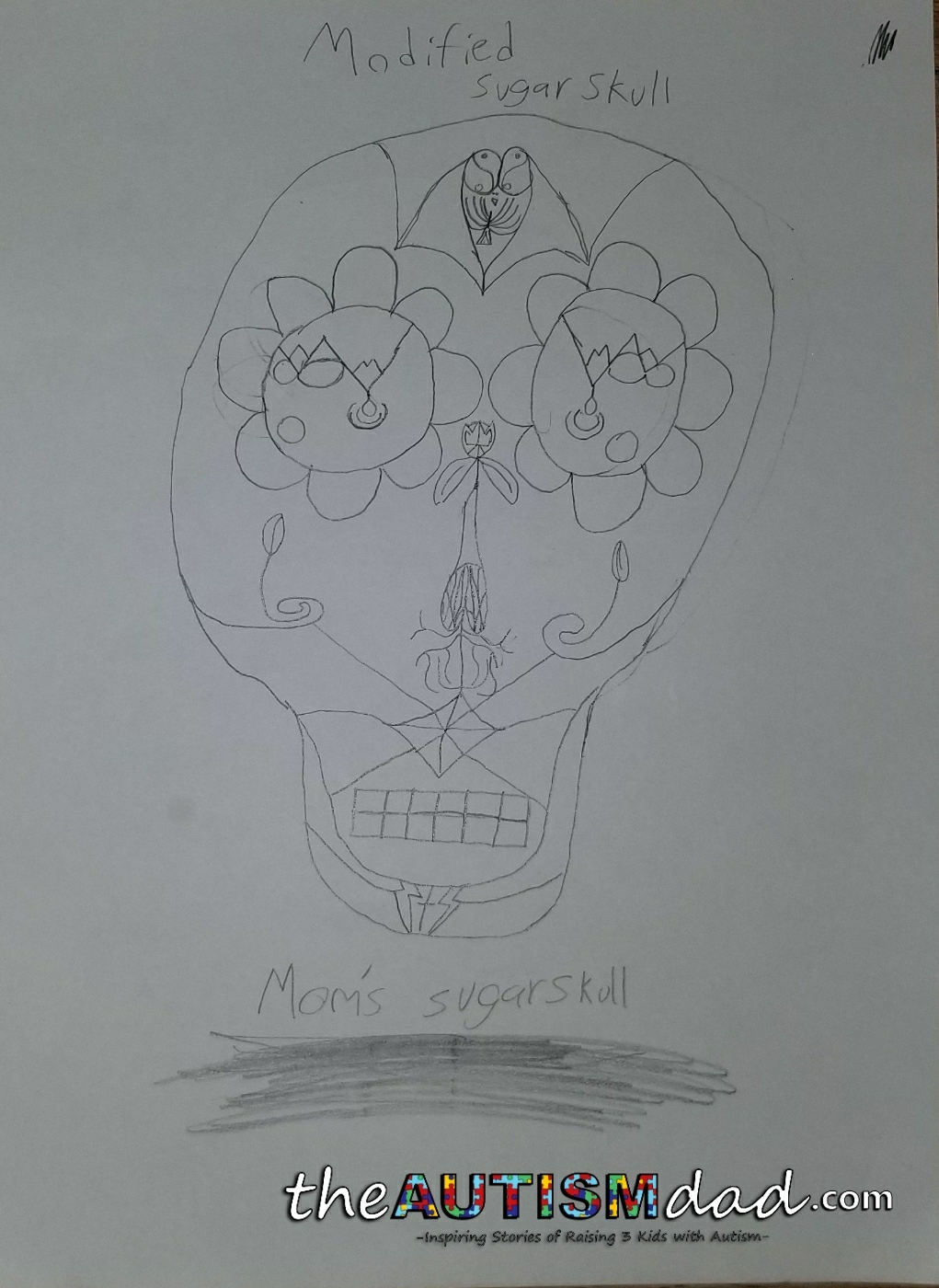 Elliott was kind enough to allow me to take a picture of his latest drawing. This is what he remembered a Sugar Skull looking like.