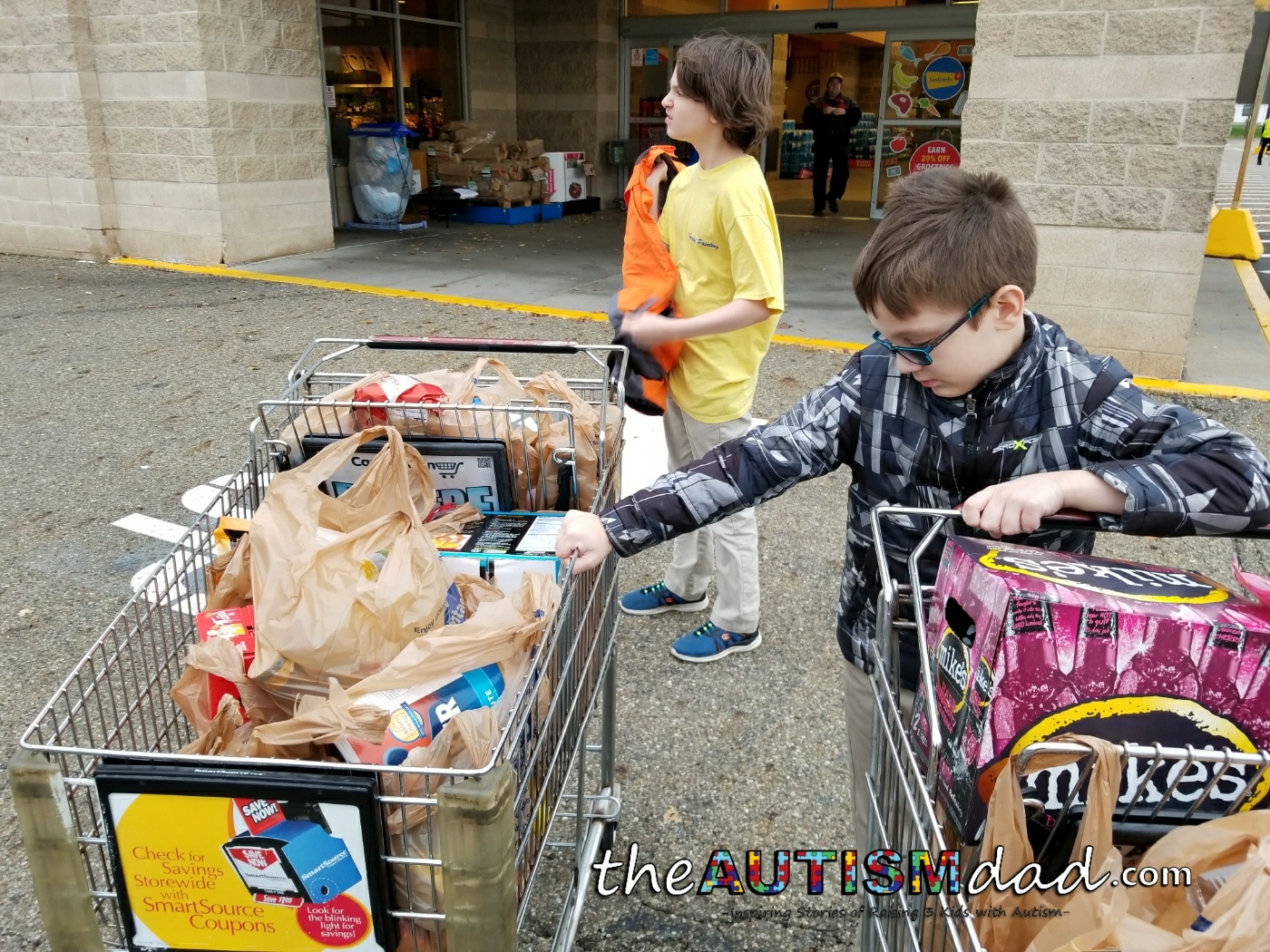 The other say, I took the boys to the grocery store, along with our recycled bags. I picked them up after school and went straight to Giant Eagle. Taking kids with Autism *anywhere *can prove to be very challenging. Taking two of them is challenging.. lol