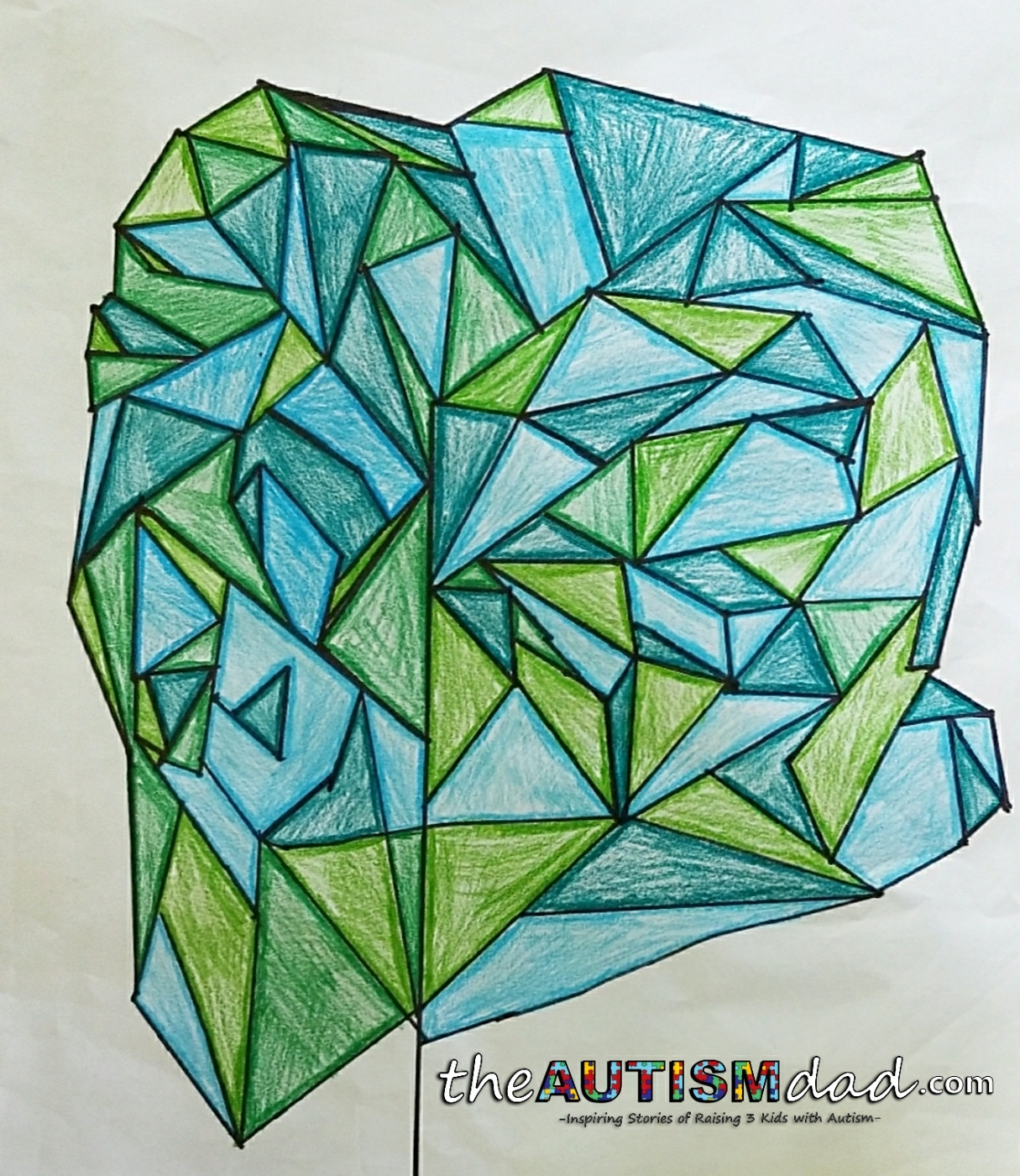 I wanted to share some amazing artwork done by Elliott. He brought this home from school after working on it for quite awhile. I think it's really cool. I like the geometric shapes and the way he colored it. ☺