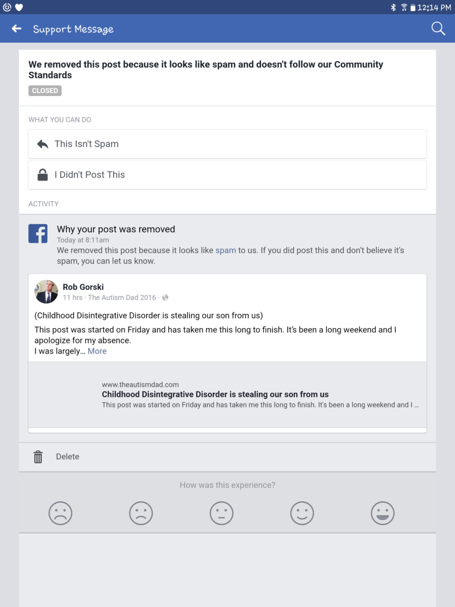 As a stay at home Dad raising three kids with special needs, my blog also serves as a means of supporting my family. Not only is this person removing posts from my personal timeline and page, they are also taking food out of my kids mouths as well. I've worked very hard to become as financially independent as possible. We're doing so much better but things like this make it much, much harder to maintain.