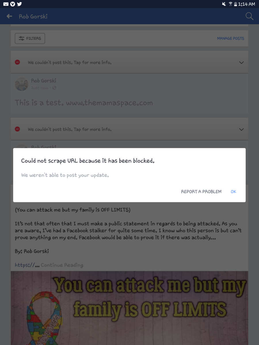 Lizze runs her own blog at www.themamaspace.com... At some point last night, her url became blacklisted or blocked by Facebook, because it's been reported as violating Facebook's community guidelines. This is the same thing that I've been battling since January of this year. Please take a second and check out her site. I know she'd appreciate the support.