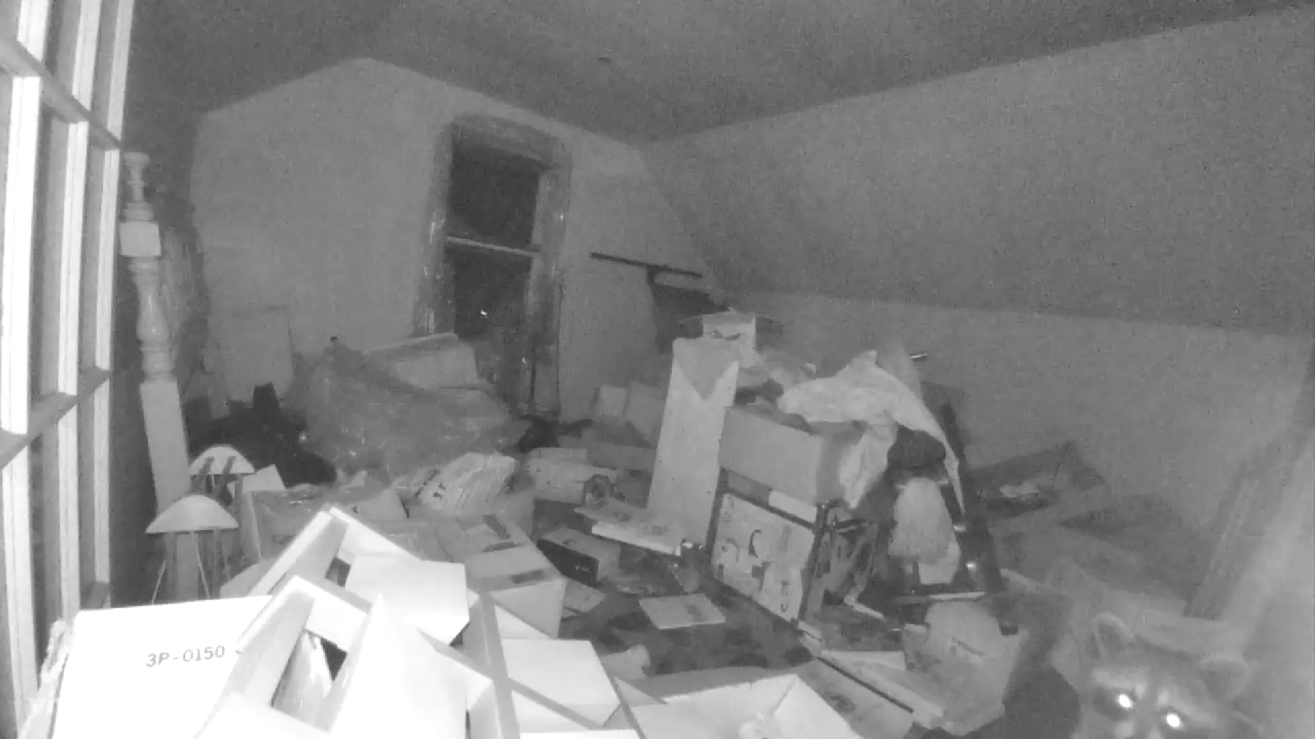 This raccoon is fucking huge and I don't have a clue how to get rid of it. I tried screaming through the intercom on my camera but it only made it curious about the camera. This is the second raccoon we've had invade our home. The first one was killed by Maggie. At the time, we didn't know it was a raccoon and she tore off up into the attic. We thought she would scare the shit out of the squirrels but turns out it was much more serious.