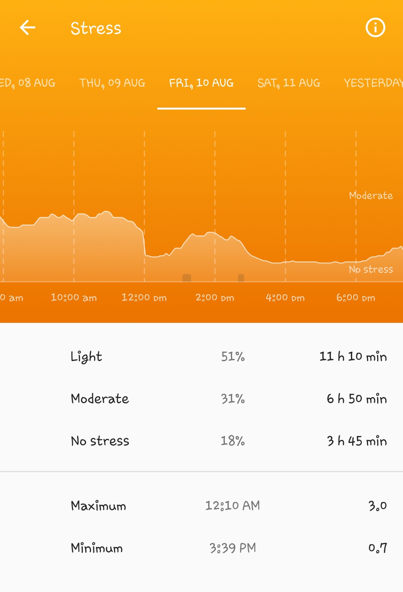 You can see that your stress levels are displayed inside the app on an hourly diagram or chart. Stress is rated on a scale of 1 to 5. 1 being *no stress *and 5 being *Hight Stress Level. *