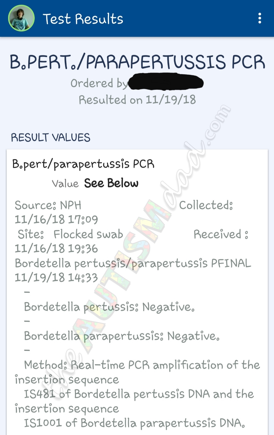 This is awesome news. Unfortunately, he's still sick with something but at least it's not Whooping Cough. The antibiotics seems to be helping and his cough sounds *Croupy. *He would need to be on antibiotics for that anyway.