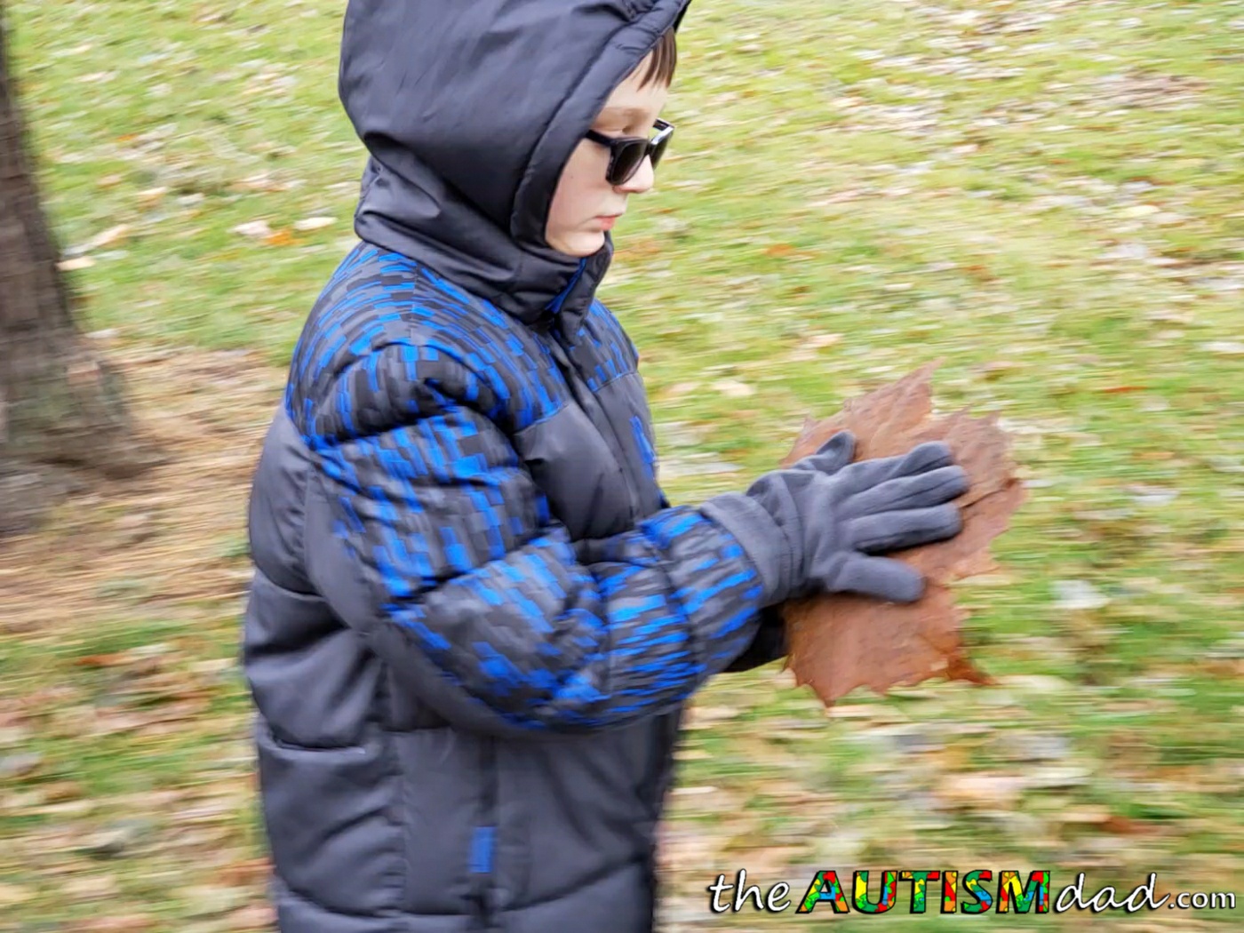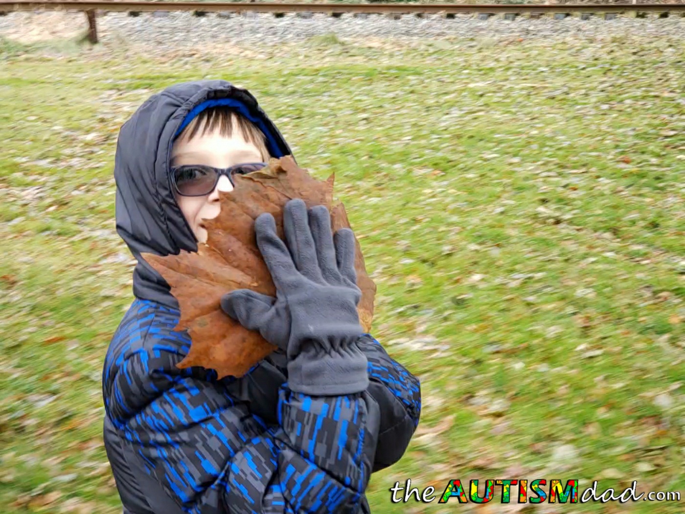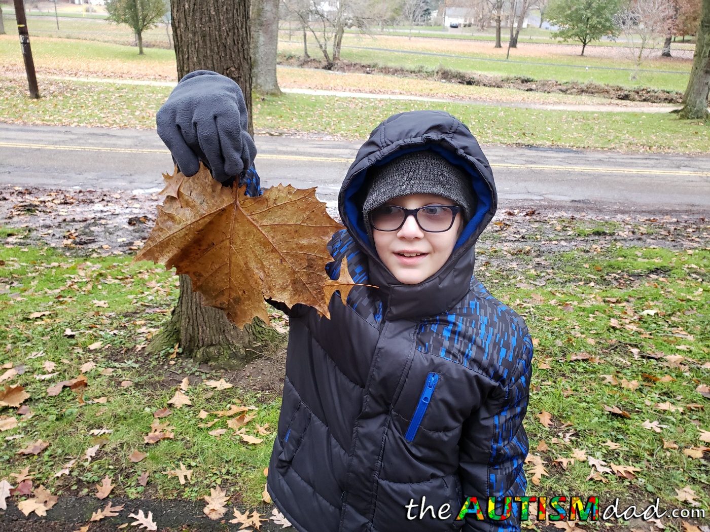 It was about 30°F and he was all bundled up. We talked for most of the walk and inside of the first mile, he found this giant leaf. You'd of thought it was made of gold because he was just enamered by it.