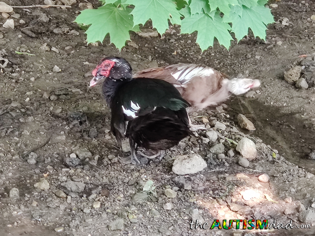 They are domestic Muscovy ducks. I assume the black one is the male, and the lighter one is the female. The Lonely Duck, seen in the image below with Emmett, has been here for over a year now. She made it through the winter and is either alone or with the geese. She stays away from the other native ducks for some reason.