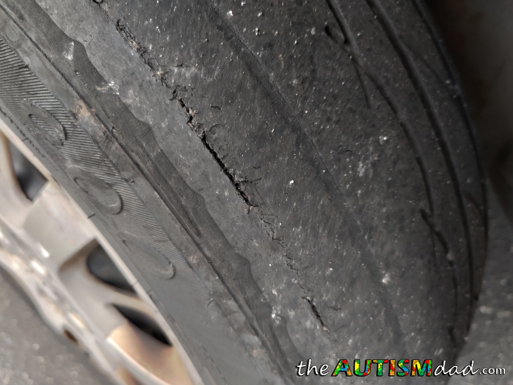 I ended up having to go to four different gas stations before I found a working compressor and by that time, I really needed to be on the road. I topped off the first three tires and when I came to the last one, I noticed a problem. The outside edge of the tire had split open and exposing the steel belt. I'm not a huge car guy, but I didn't feel comfortable driving on that tire after seeing it.