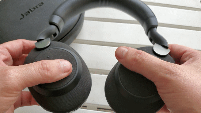 The Jabra Elite 85h is unique in a few ways. For starters, there's no power button. The headphones turn on and off by rotating the right ear cup as seen below.