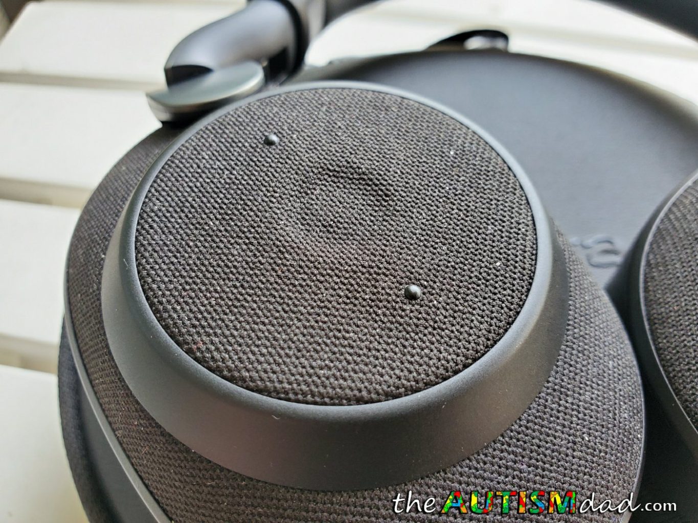 The outside of the ear cups is covered in a fabric material. I'm not sure what led to that design choice but it works fine for me. It actually gives the Jabra Elite 85h a unique look.