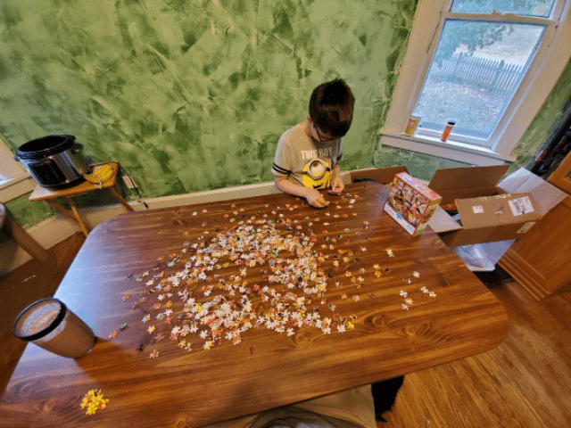 I want to end the day on a positive note, by sharing something cool that the boys and I did as a family. A large part of this was Emmett and myself. Frankly, Emmett was the muscle behind this puzzle. ☺
