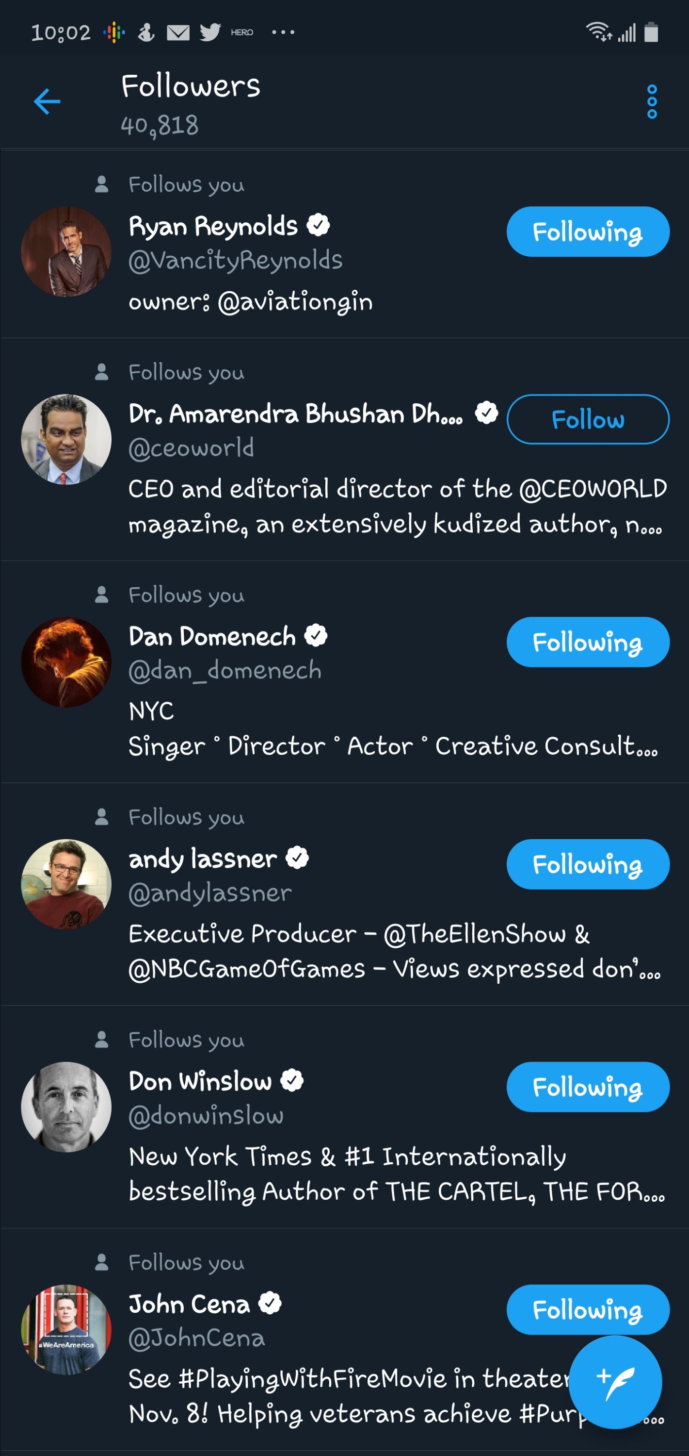 Ryan Reynolds, John Cena and Andy Lassner followed me in the same roughly 24 hour period of time. I've got a ever growing list of absolutely amazing followers and I'm grateful for every single one of them. This week's additions just sorta blew my mind. I'm humbled and honored. ☺