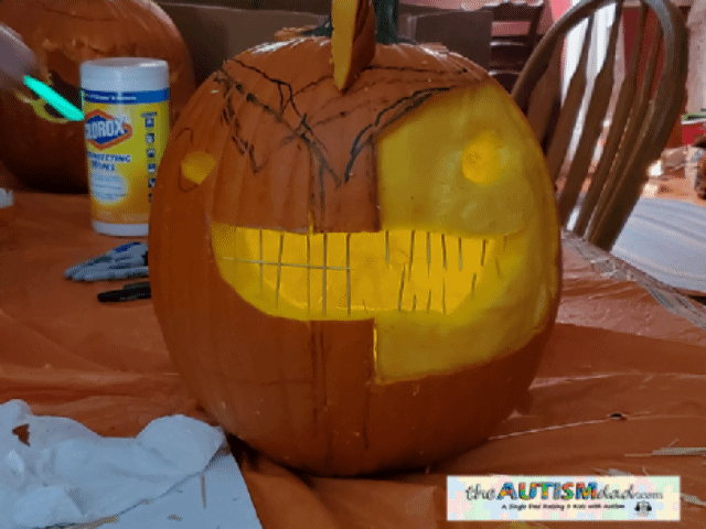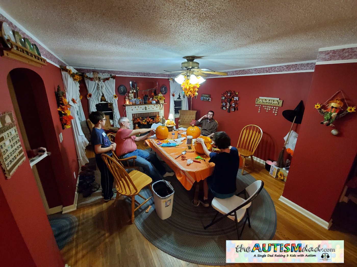 The boys and I headed to my parents house tonight for a special, fun Halloween dinner. My mom is incredibly creative and has a ton of fun putting this together for them every year. After dinner, the kids carved pumpkins, as is tradition.