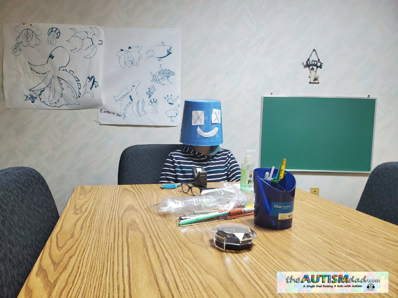 Mr. Emmett went and found a blue bucket, cut out facial expressions, and taped them to the outside of the bucket before putting it over his head in an attempt to avoid talking about these things. He evertually opened up but it took some time.