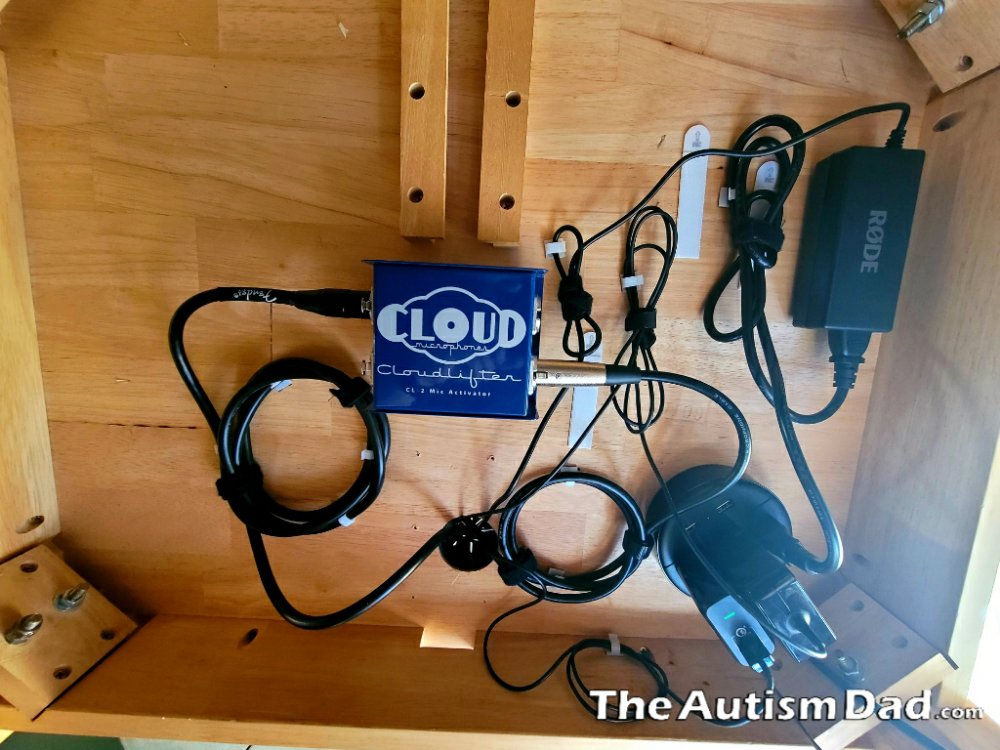 The underside of my table now contains all wires and cables for my laptop, mixing board, cloud lifter, microphone, and power supplies. Everything is secured, organized and out of sight.