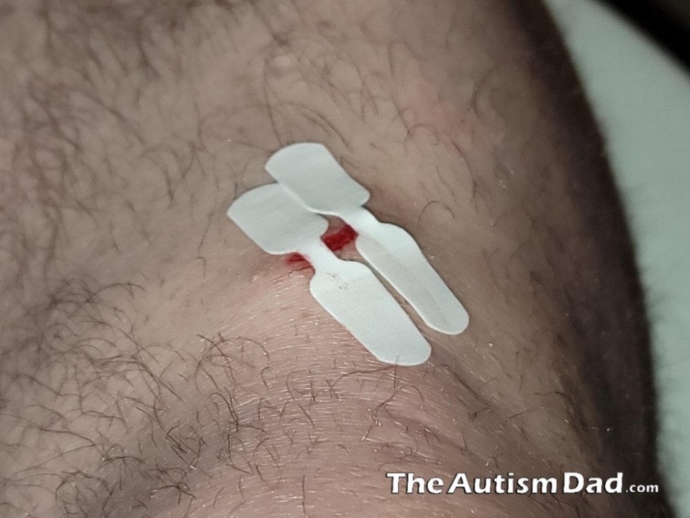I was quite calm and controlled because I felt pretty comfortable managing this on my own. Our brand new first aid kit was lacking butterfly bandaids, so my Dad raided their first aid kit and dropped some off on the front porch. He was more than willing to help me but COVID made that not a good idea.