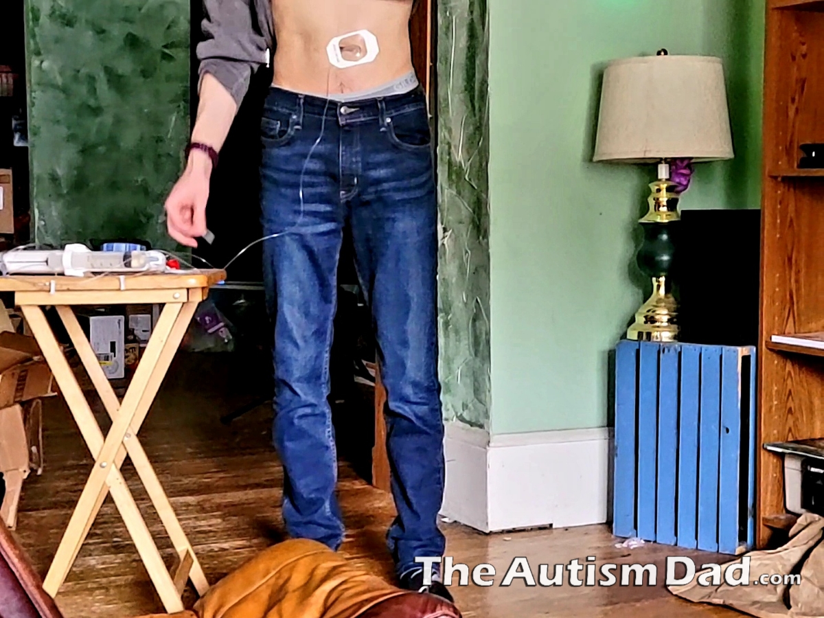 I wasn't sure if he was asking me to do the needles for him or if he was just venting frustration with himself. Either way, I knew it was really important for Gavin to work through this on his own. I had him bring his supplies downstairs and I simply talked him through it. He thinks a bit differently than many other people and he didn't understand why his hands were not pressing the needles into his belly. I explained that his hands weren't doing it because he didn't want them to.