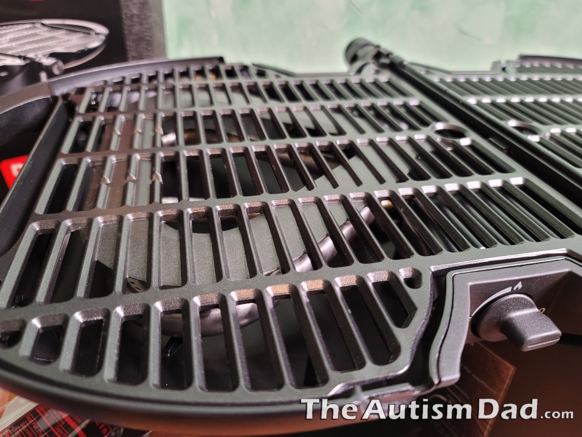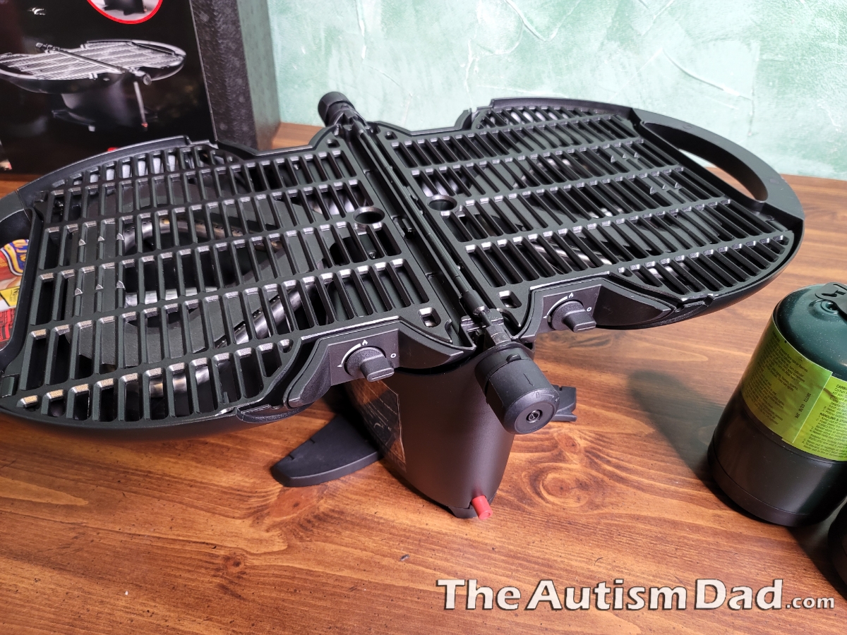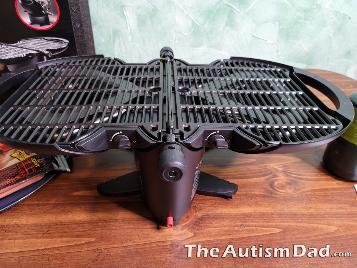 The nomadiQ grill folds up into a state that makes it incredibly easy to both carry and store when not in use. To use the grill, you have to swing out the feet from the bottom and pull the 2 knobs and lock them in place. Then you simply lift the grill up by the handles and it opens up. It's sorta like butterfly wings. That's what the kids pointed out anyway. Once the grill is open, you can screw on the gas line. Since there are 2 burners, one on each side, there are two gas inlets. Once those are secured into place, you attach the propane tank and that's pretty much it. When you're ready to light the grill, you turn the burner knobs, press the electronic ignitor and wallah. The whole setup takes less than a minute and it's super easy.