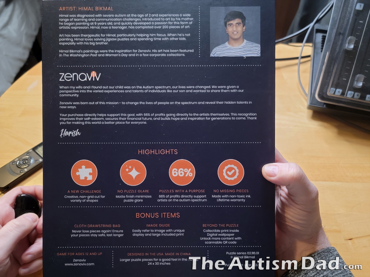 Back to the puzzle. The Zenaviv puzzle stands out for a number of reasons. First of all, it's an amazing cause and one that I completely support. As the father to 3 autistic kiddos myself, this hits close to my heart.