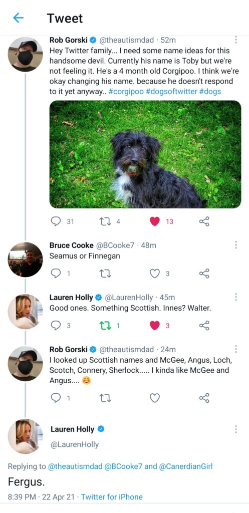 Hey Twitter family... I need some name ideas for this handsome devil. Currently his name is Toby but we're not feeling it. He's a 4 month old Corgipoo. I think we're okay changing his name. because he doesn't respond to it yet anyway.. #corgipoo #dogsoftwitter #dogs pic.twitter.com/oZ1Yolhm49— Rob Gorski (@theautismdad) April 23, 2021
