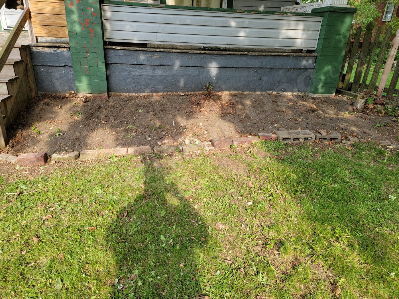 There used to be one and half foot stone wall about two feet off the base of the porch. It was made of barnstone. I pulled the wall down and merged the two flower beds into one larger one. We also pulled all the plants and got it cleaned out. I'll replant after we paint.