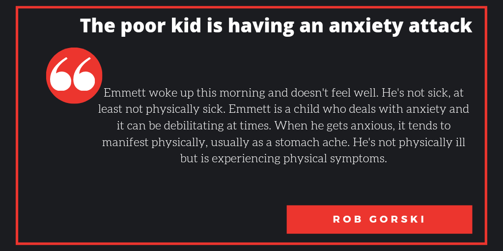 Emmett woke up this morning and doesn't feel well. He's not sick, at least not physically sick. Emmett is a child who deals with anxiety and it can be debilitating at times. When he gets anxious, it tends to manifest physically, usually as a stomach ache. He's not physically ill but is experiencing physical symptoms. Make sense?