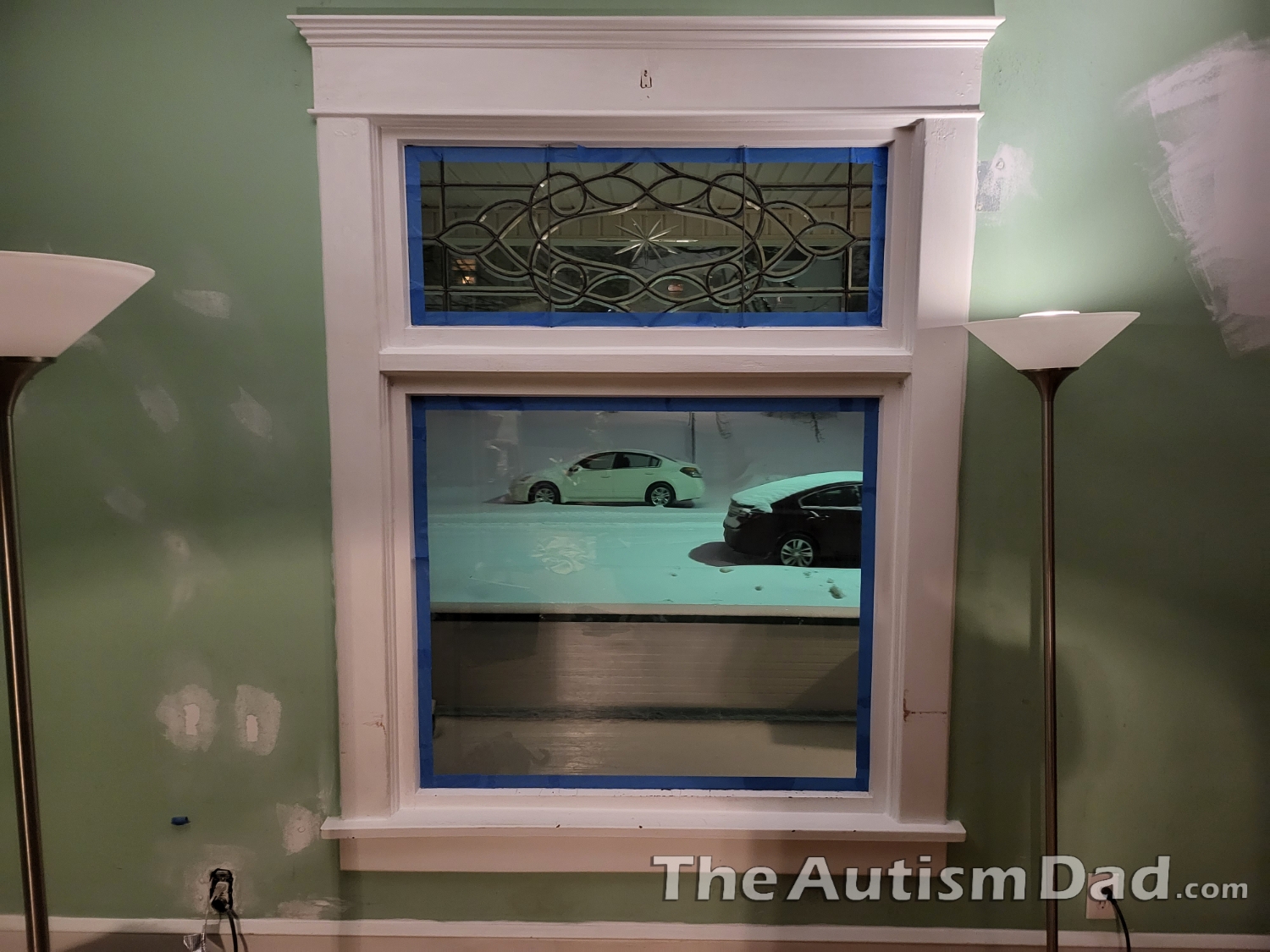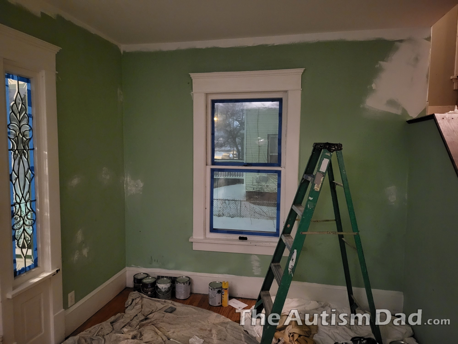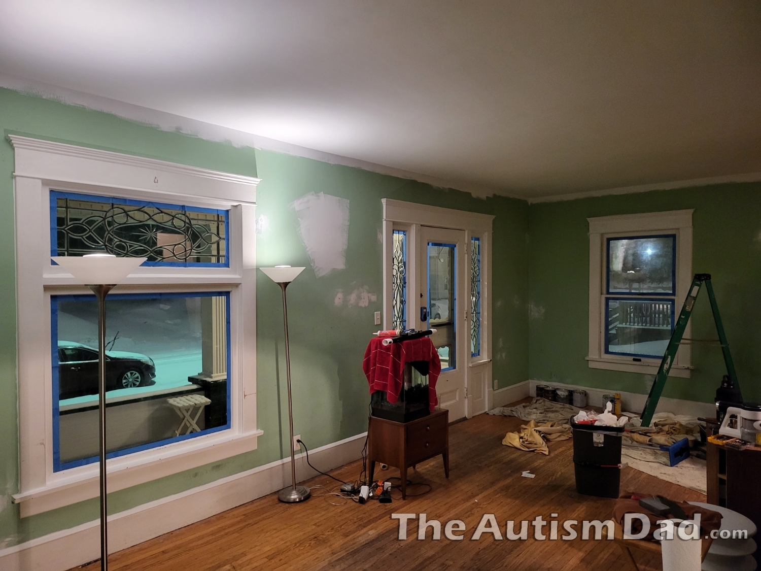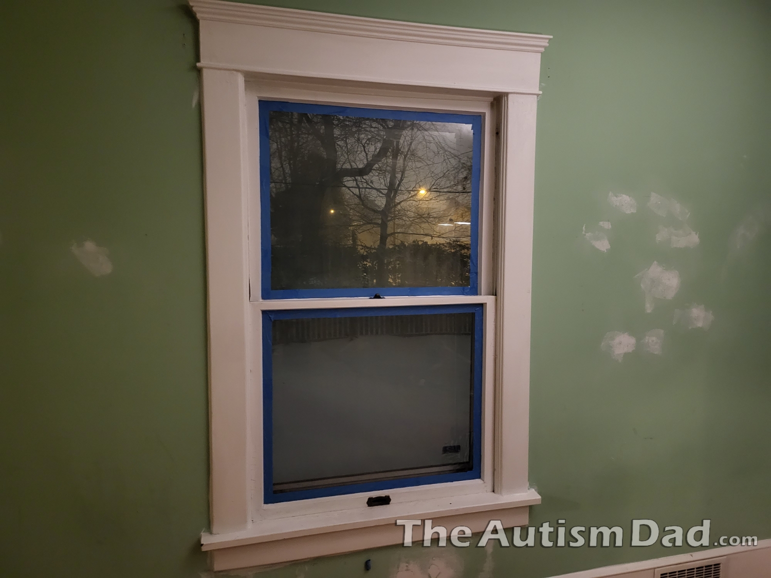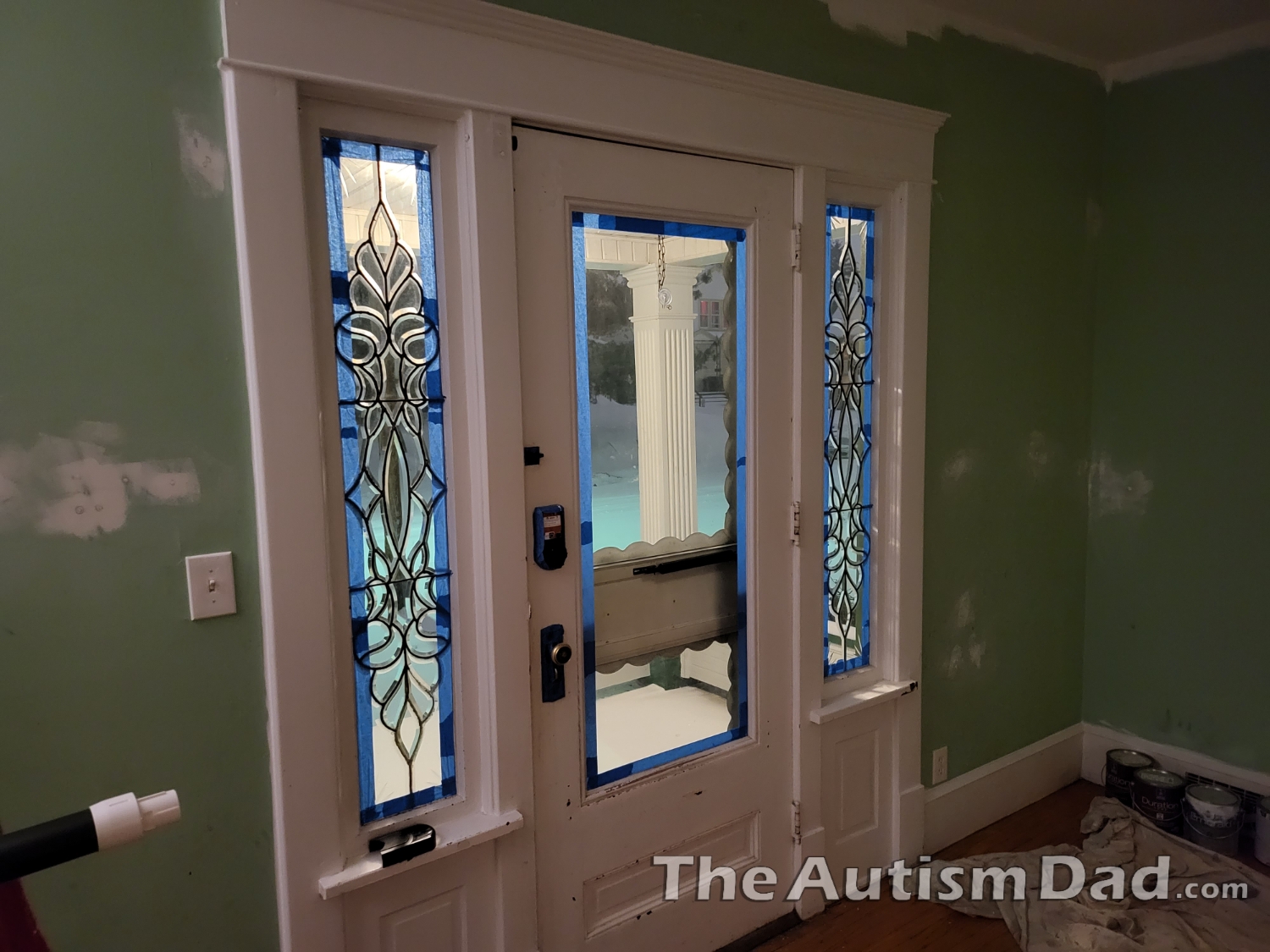 This morning I began prepping all the trim (base-boards, door casing, windows, window casing, and front door). It took forever but it turned out great. I recaulked almost everything, which is tedious, and took forever. All the woodwork is repaired, and ready for paint. The last thing I did was tape off all the windows.
