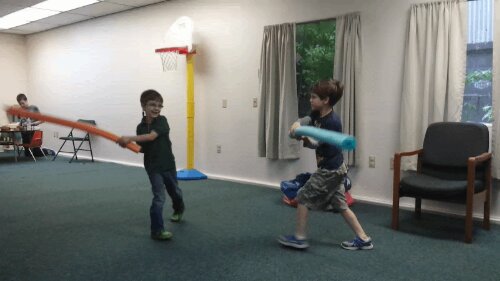 While at therapy tonight, the boys discovered that Dr. Pattie had some pool noodles. We let Elliott and Emmett sorta go at it for a little while.