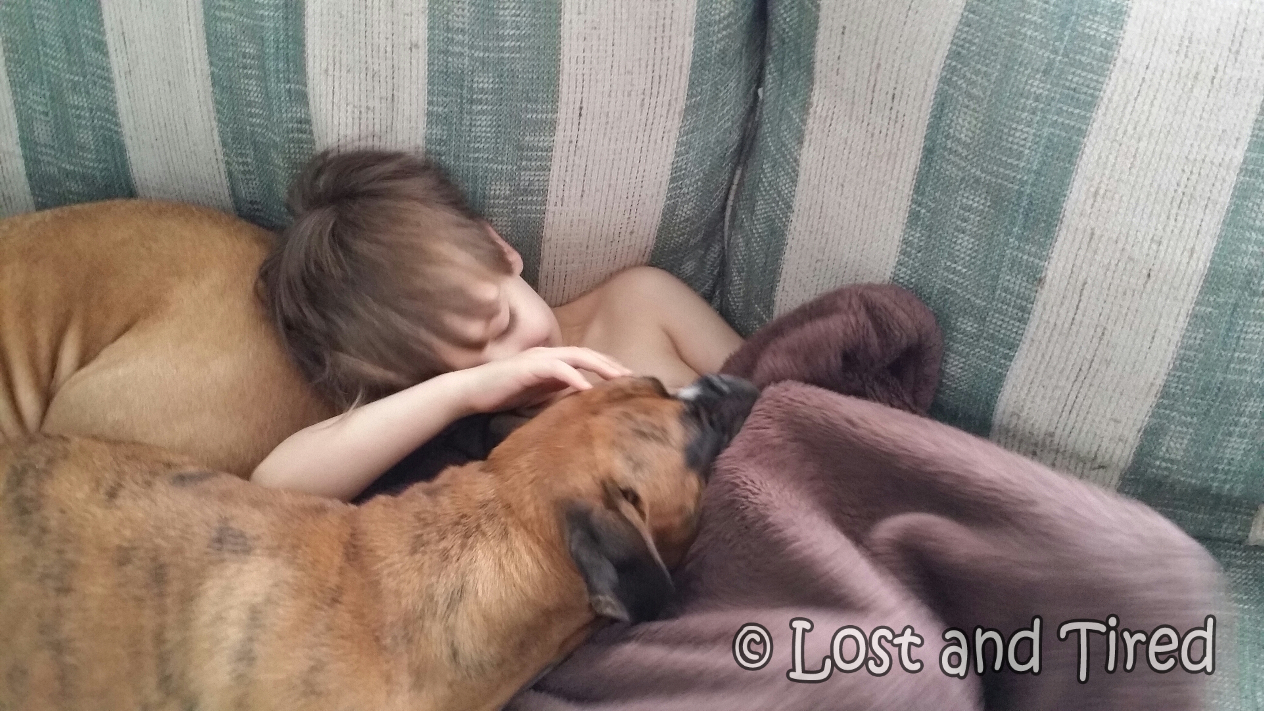 Emmett was snuggling on the couch with his living, breathing weighted blankets. They are called Maggie and Bella. It's amazing just how much insight these dogs are capable of.