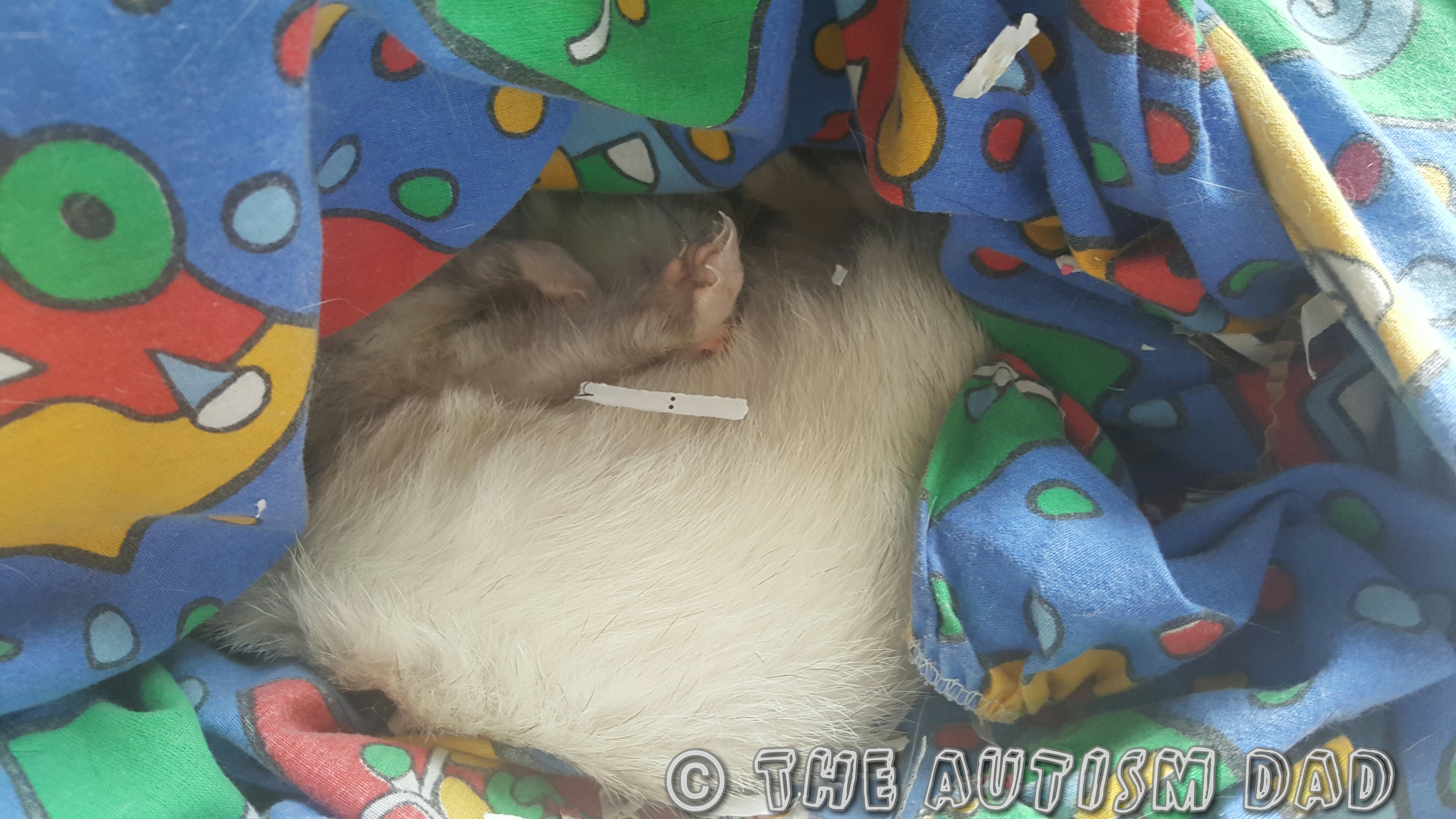 For example, if Emmett is really upset about how his shoes or socks feel, holding a ferret tends to help him at least feel better. He will hold Fat Tiny and Tiny will kick his face until he starts to giggle. It doesn’t always impact him actually wearing his shoes or socks but it does help him relax after the ordeal.