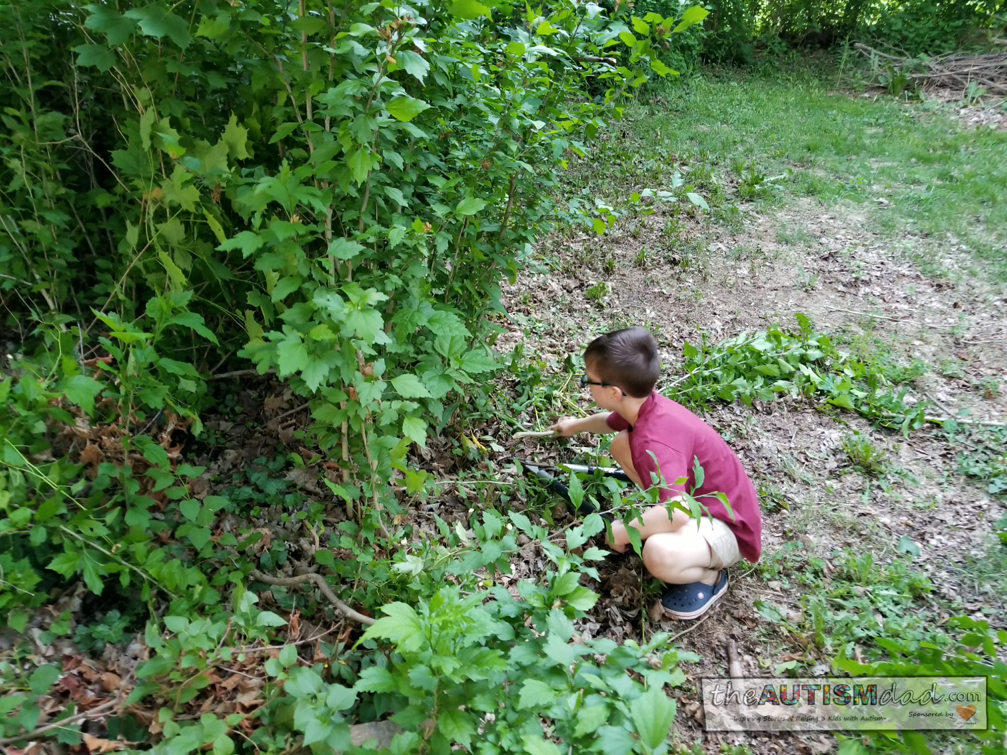 He’s pulling the small sprouts out by the roots, and that takes some strength. I’m also letting him use the loppers, and the pruners, to cut down what he can’t pull out of the ground. Of course, I closely supervise him for safety.