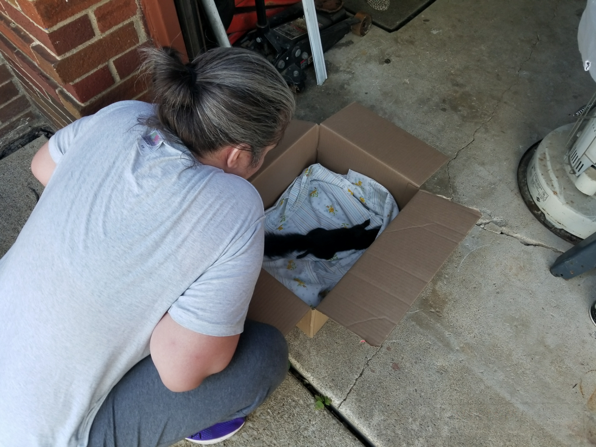 The little squirrel didn’t bite or show any aggression. My Mom put a box together, with an old sheet, and Lizze gently placed the baby in there.